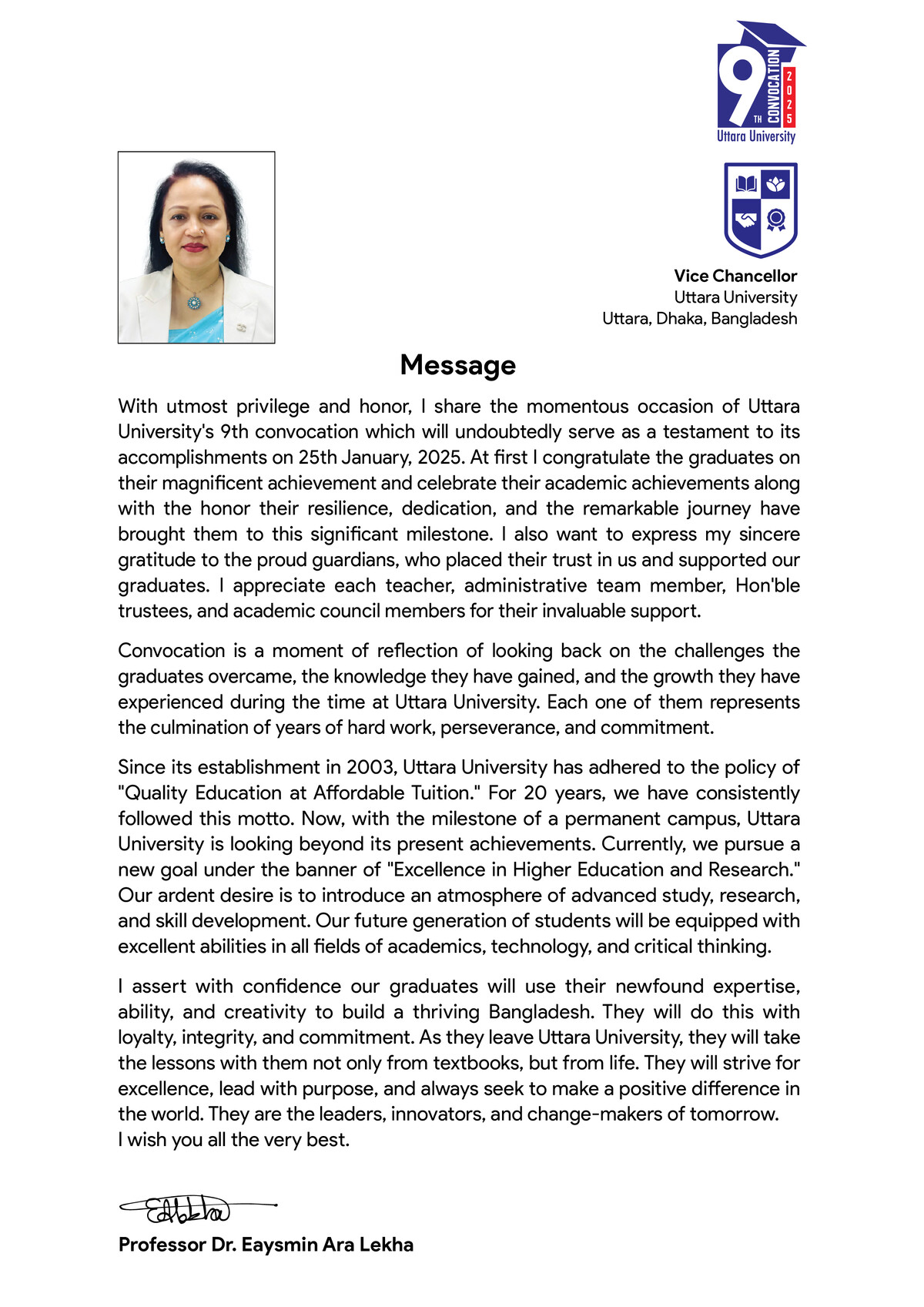Professor Dr. Lekha, PhD, is a pioneering figure in the field of education in Bangladesh, serving as the Vice Chancellor of Uttara University since 2023. With a diverse academic background and nearly three decades of experience in academia, she has made significant contributions to the field of education through her teaching, research, and administrative roles. Dr. Lekha’s leadership qualities were recognized early on, leading her to serve in key administrative roles within Uttara University, including as Pro Vice-Chancellor. Her proactive measures during the COVID-19 pandemic ensured the continuity of education for students and job security for staff. Beyond academia, Dr. Lekha is also involved in business management and social initiatives, demonstrating her unwavering commitment to promoting accountability and equity within the academic community. Through her multifaceted engagements, she continues to make a significant impact on education, business, and social welfare in Bangladesh.